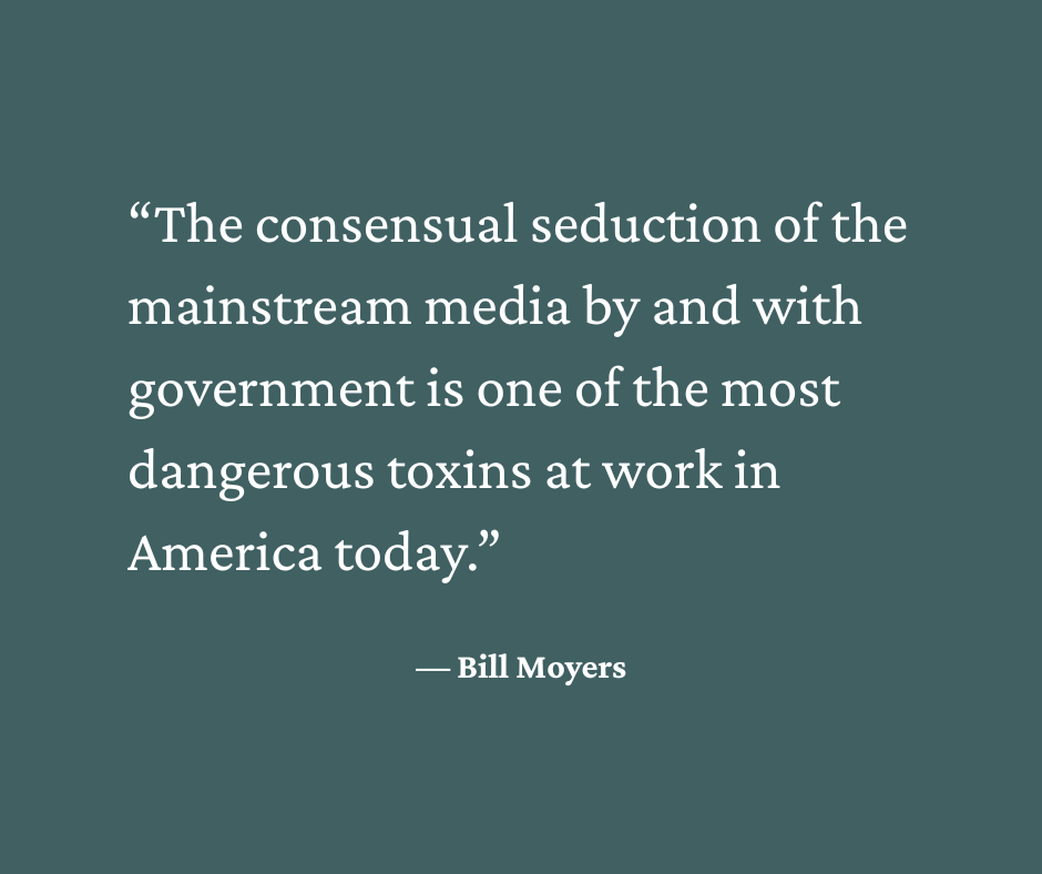 As part of their holiday lineup, Democracy Now! reflected on their 2011 interview with the journalist and public figure, Bill Moyers. In the interview, Moyers raises concerns that seem more prescient today than perhaps they were 14 years ago when the interview first aired. An iconic quote — his opening line, in fact — is featured in the image below: